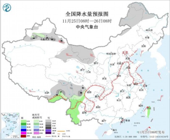 11月25日08時至26日08時,新疆沿天山地區(qū)和伊犁河谷、甘肅中北部、內(nèi)蒙古東部和西部、黑龍江西北部、青海南部、西藏東部、西南地區(qū)北部等地部分地區(qū)有小雪或雨夾雪,其中,新疆沿天山地區(qū)和伊犁河谷、川西高原南部等地部分地區(qū)有中到大雪(5~9毫米)。西藏南部、四川南部、云南西部、臺灣島大部等地部分地區(qū)有小雨。新疆東部、內(nèi)蒙古中西部、青海北部、甘肅、寧夏、遼東半島、山東半島、西藏北部等地部分地區(qū)有5~6級風、陣風7~9級;渤海、黃海、臺灣海峽、臺灣以東洋面、東海、南海等部分海域?qū)⒂?~7級風、陣風8~10級。