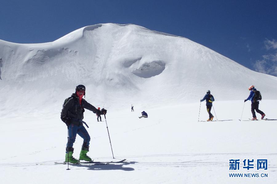 ↑記者第一次見到劉百靈是在第十六屆西藏登山大會滑雪登山項(xiàng)目的營地——洛堆峰雪線處,海拔5600米。劉百靈膚色黑得發(fā)亮,與身邊長年從事高山訓(xùn)練的藏族教練無異。但細(xì)問起來,他說自己生在湖南,現(xiàn)居杭州,是地道的南方人。 因?yàn)閷敉膺\(yùn)動(dòng)尤其是對滑雪的執(zhí)著,劉百靈的膚色變了,過起了旁人眼中的另一種人生,也成了“異類”。但他卻感謝自己成了“異類”。這是10月4日,滑雪愛好者、“體育旅游”探索者劉百靈(左)在位于西藏自治區(qū)當(dāng)雄縣羊八井鎮(zhèn)的洛堆峰雪坡上練習(xí),此處海拔約5700米。遠(yuǎn)處的山峰是海拔7048米的窮母崗日峰。 新華社發(fā)