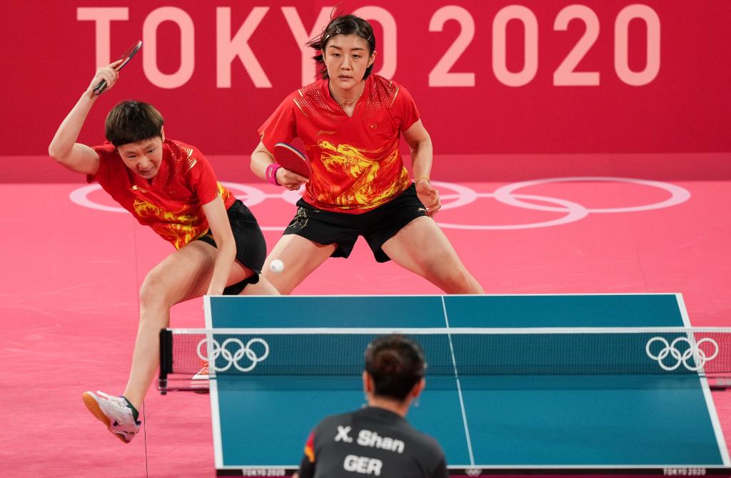8月4日,中國隊(duì)組合王曼昱(左)/陳夢(mèng)在比賽中。新華社記者劉大偉攝