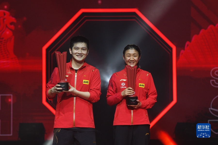 3月20日,中國(guó)選手樊振東(左)與本次比賽女單冠軍、隊(duì)友陳夢(mèng)在頒獎(jiǎng)儀式上。新華社發(fā)(鄧智煒攝)