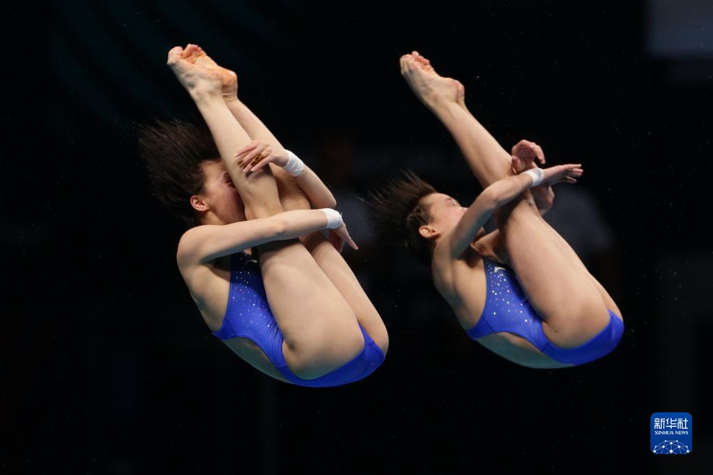 6月30日,陳芋汐(左)/全紅嬋在比賽中。當(dāng)日,在匈牙利布達(dá)佩斯舉行的2022年世界游泳錦標(biāo)賽跳水項(xiàng)目女子雙人10米臺決賽中,中國選手陳芋汐/全紅嬋奪得冠軍。新華社記者 鄭煥松 攝