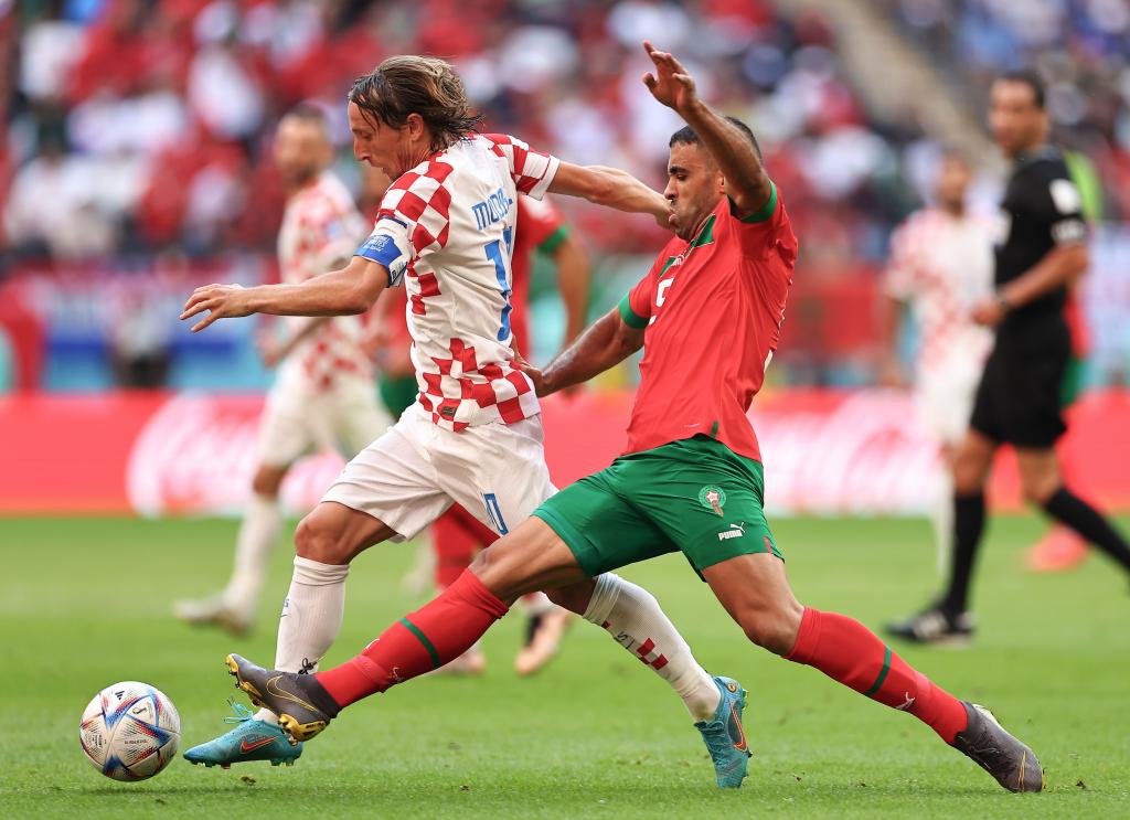 11月23日,克羅地亞隊球員莫德里奇(左)與摩洛哥隊球員阿格德拼搶。新華社記者丁旭攝