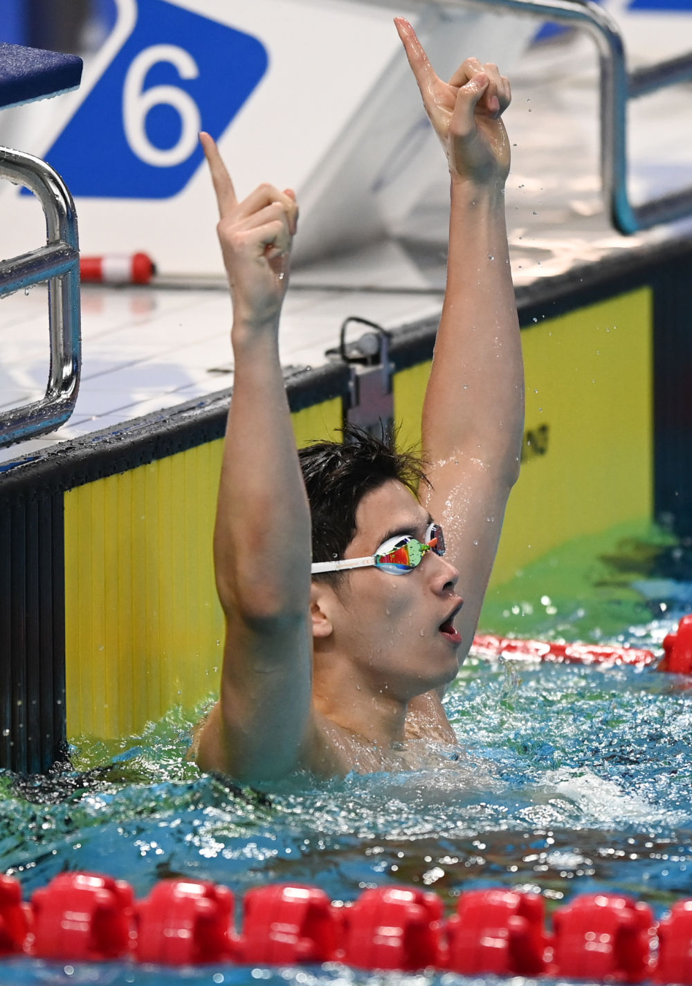 “前面我想跟著順哥(汪順)游,后來覺得自己還能更快一些,就放開了游。不過最后50米我還是有些擔心順哥的沖刺能力。他在陜西全運會上以1分46秒14奪冠的時候,我還只能游到1分48秒,沒想到真的能夠超越前輩。”潘展樂賽后說。