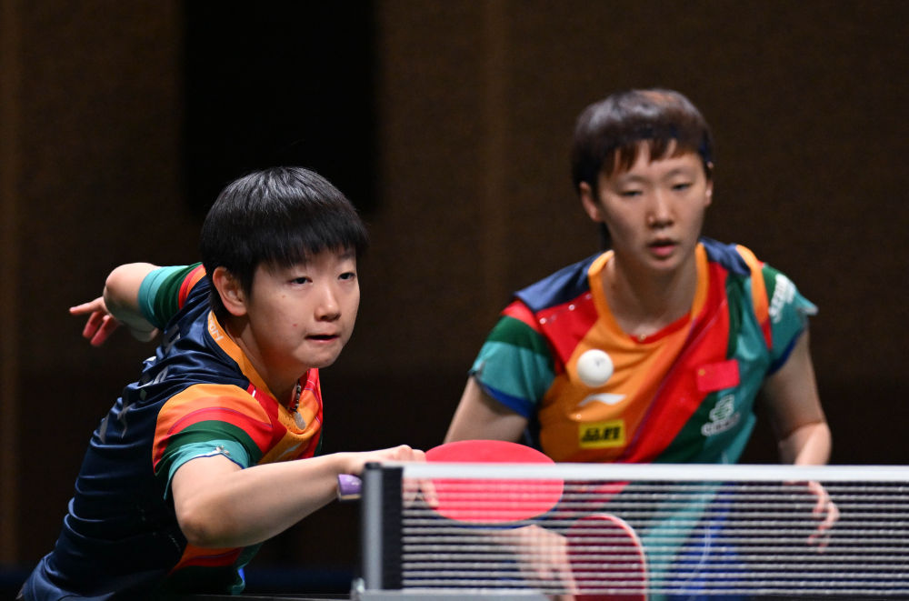 5月23日,王曼昱/孫穎莎(左)在比賽中回球。新華社記者 陶希夷 攝