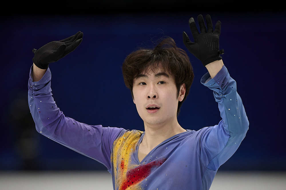 3月25日,中國選手金博洋在2023年世界花樣滑冰錦標(biāo)賽男子單人滑自由滑比賽中。新華社發(fā)(帕布羅·莫拉諾攝)