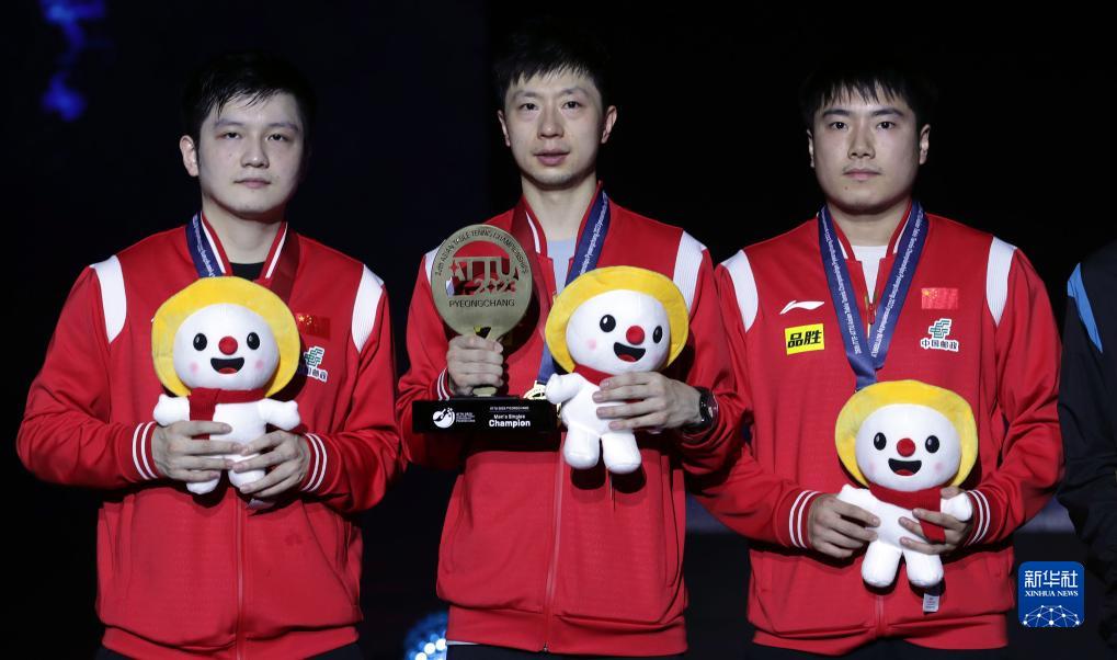 9月10日,樊振東、馬龍和梁靖崑(從左至右)在頒獎(jiǎng)儀式上。新華社發(fā)(李相浩攝)