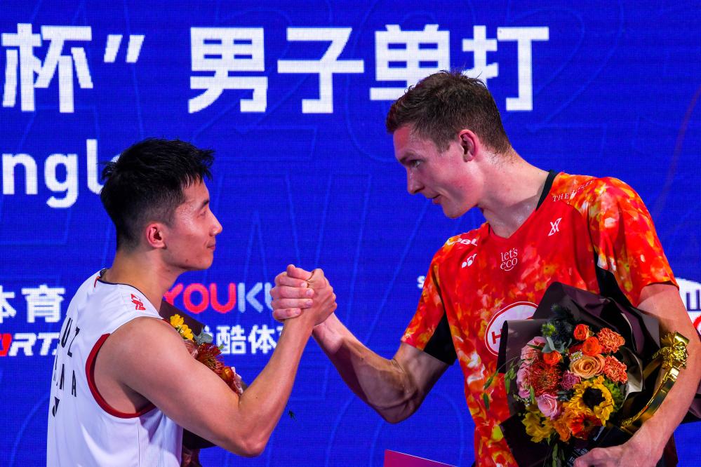 9月10日,丹麥選手安賽龍(右)與中國(guó)選手陸光祖在頒獎(jiǎng)儀式中握手。新華社記者 李博 攝