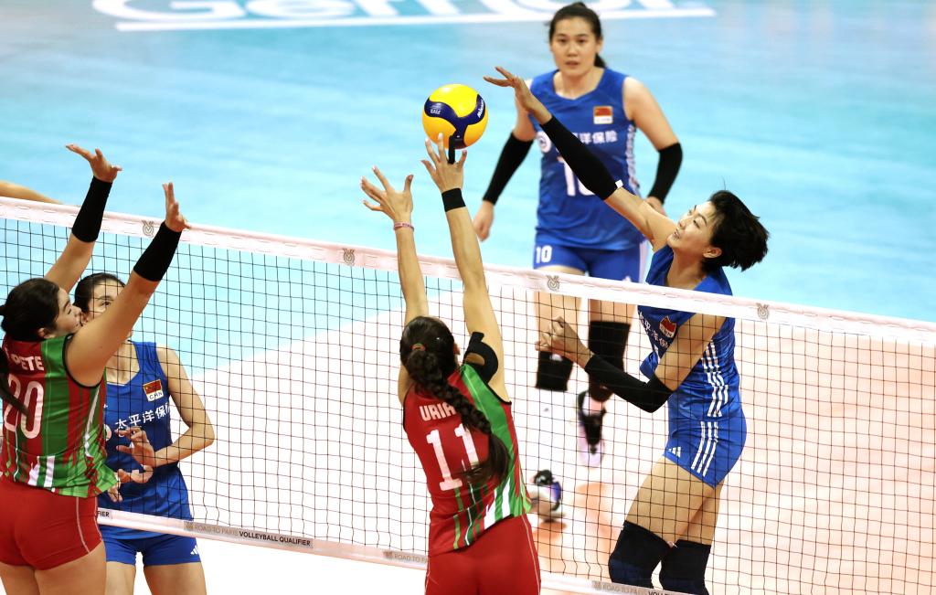 9月17日,中國(guó)隊(duì)球員袁心玥(右一)在比賽中扣球。當(dāng)日,在浙江省寧波市舉行的巴黎奧運(yùn)會(huì)女排資格賽A組比賽中,中國(guó)隊(duì)以3:0戰(zhàn)勝墨西哥隊(duì)。新華社記者 陳斌 攝