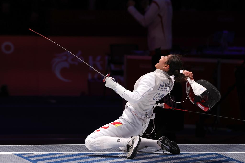 開局互相試探后,東晟良率先發(fā)起進(jìn)攻,被黃芊芊化解。在令人窒息的緊張氛圍中,兩人幾乎同時(shí)出手,黃芊芊刺中對(duì)手右肩,亮燈得分,她一把摘下面罩,怒吼慶祝。