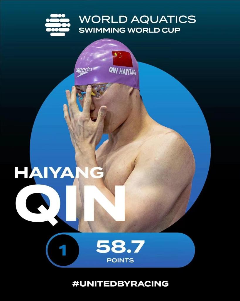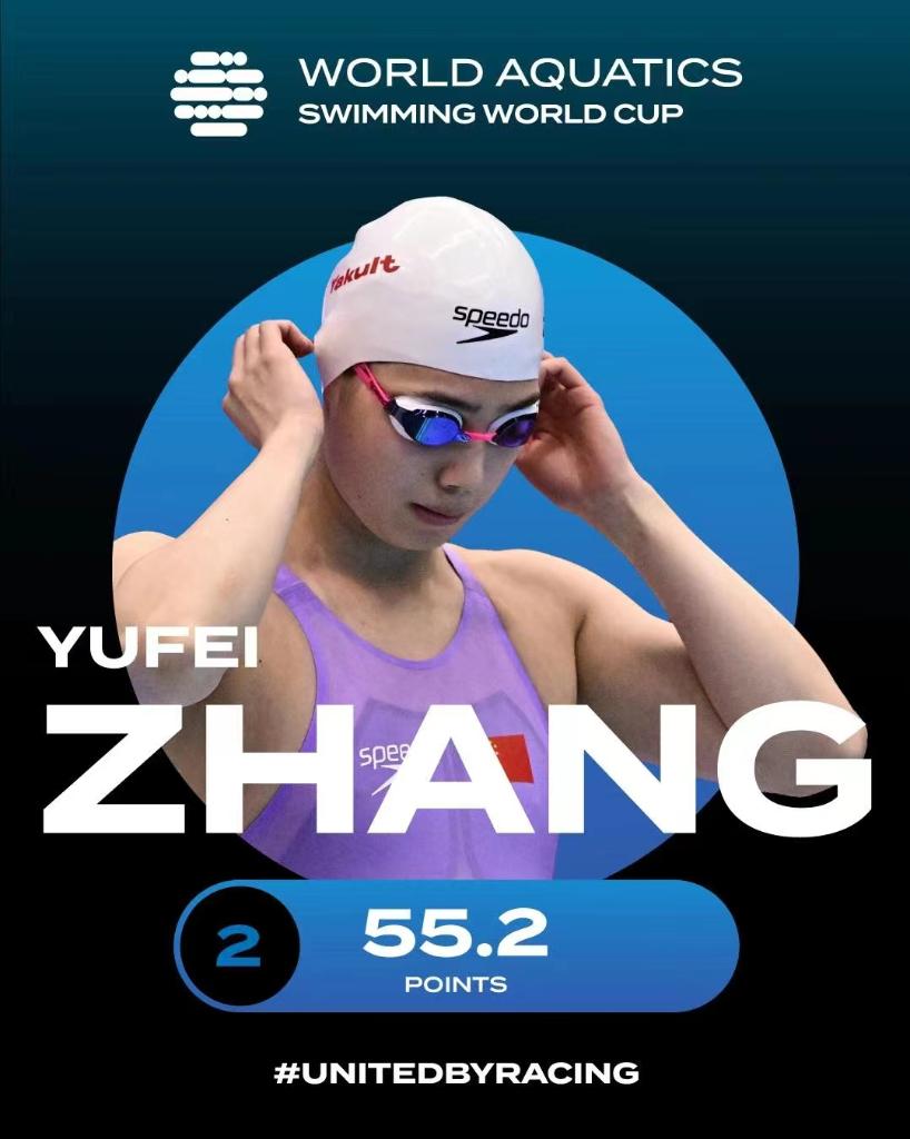 何詩蓓則以52秒02的成績改寫她9月底在杭州亞運會創(chuàng)造的女子100米自由泳亞洲紀錄52秒17,成為該項目歷史上第三快的選手,她還收獲了200米自由泳金牌和400米自由泳銅牌,在積分榜列第三名。