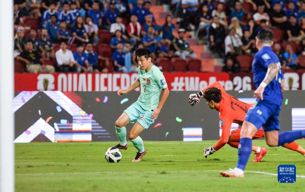 11月16日,中國隊球員武磊(左)在比賽中進(jìn)攻。當(dāng)日,在泰國曼谷舉行的2026世界杯預(yù)選賽亞洲區(qū)36強(qiáng)賽C組比賽中,中國隊以2比1戰(zhàn)勝泰國隊。新華社發(fā)(拉亨攝)