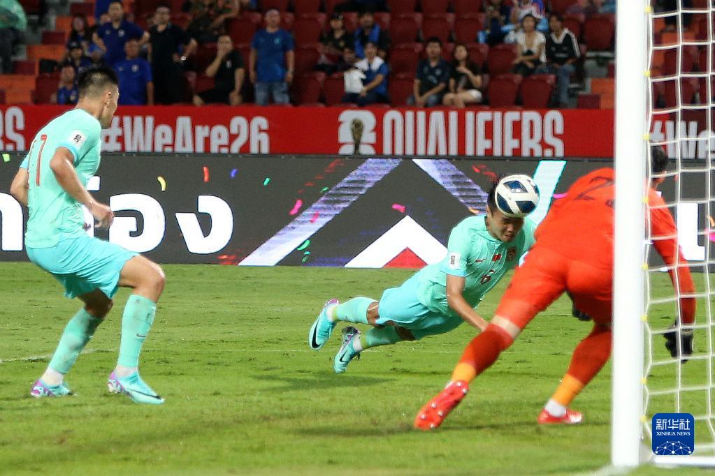 11月16日,中國隊球員王上源(中)在比賽中頭球攻門得分。當(dāng)日,在泰國曼谷舉行的2026世界杯預(yù)選賽亞洲區(qū)36強(qiáng)賽C組比賽中,中國隊以2比1戰(zhàn)勝泰國隊。新華社記者 王騰 攝