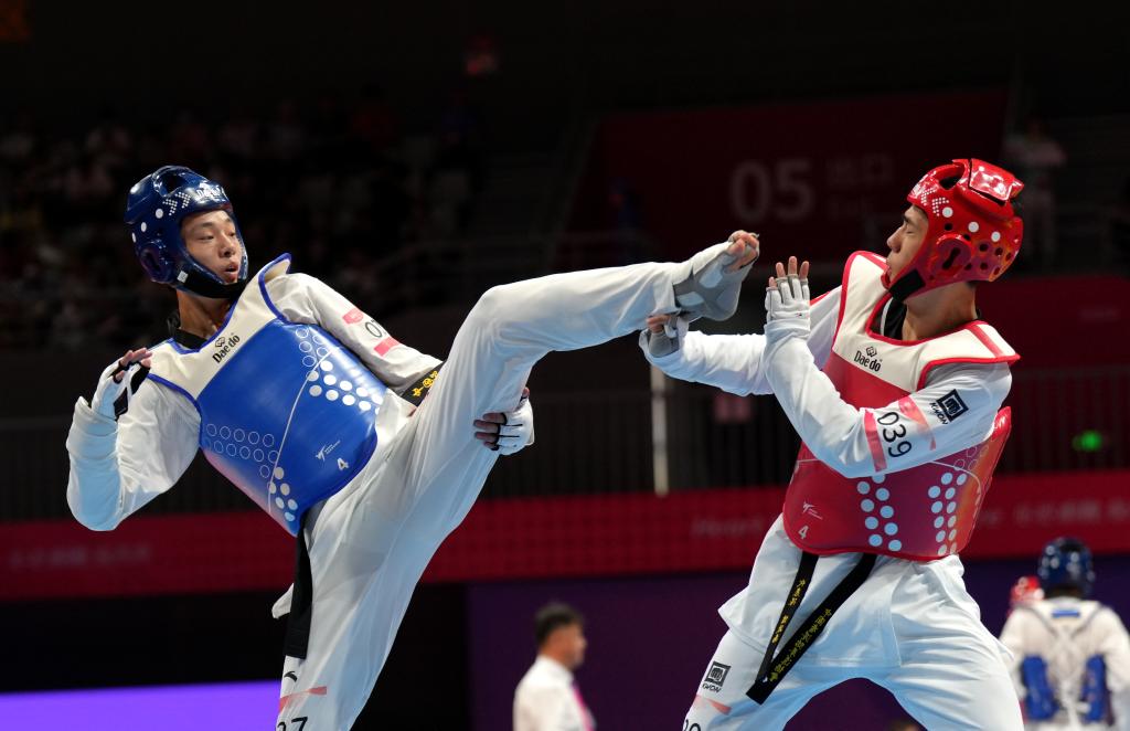 9月27日,杭州亞運(yùn)會跆拳道男子80公斤級比賽中,崔陽(左)在1/16淘汰賽中戰(zhàn)勝中國香港選手譚政南。新華社記者江文耀攝