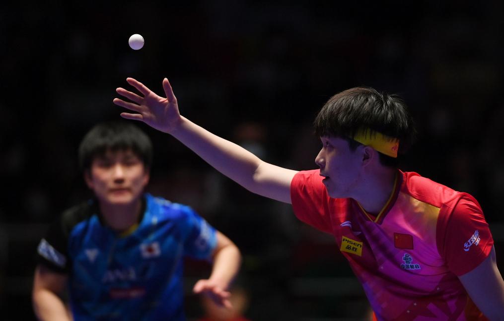 2月22日,王楚欽(右)在第二盤比賽中發(fā)球。新華社記者 陶希夷 攝