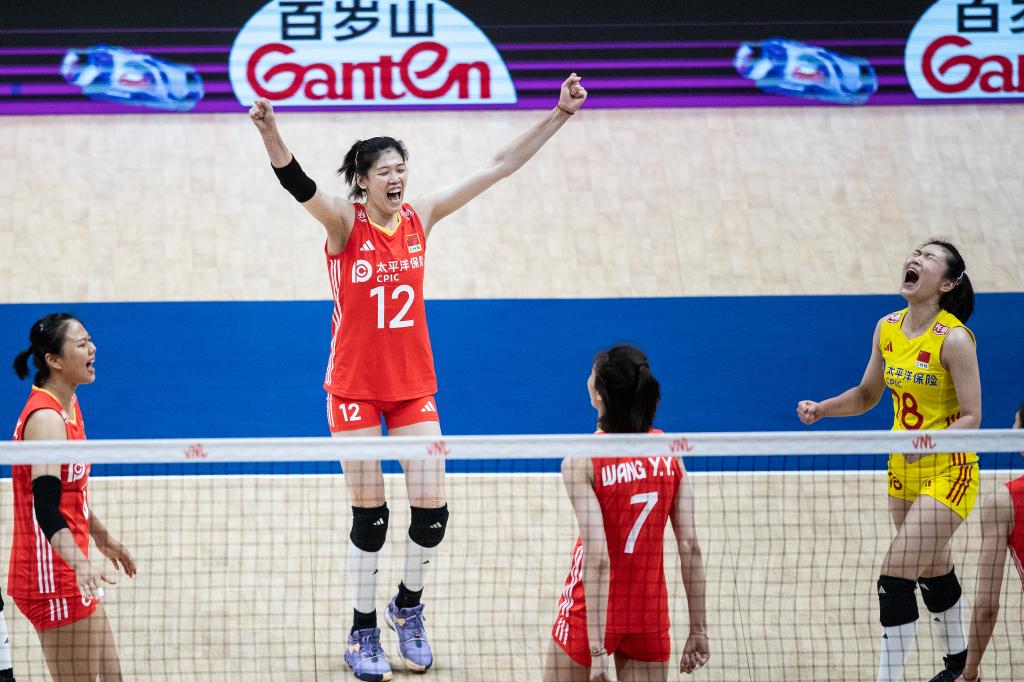 5月16日,中國(guó)隊(duì)球員在比賽中慶祝得分。新華社記者 王天聰 攝