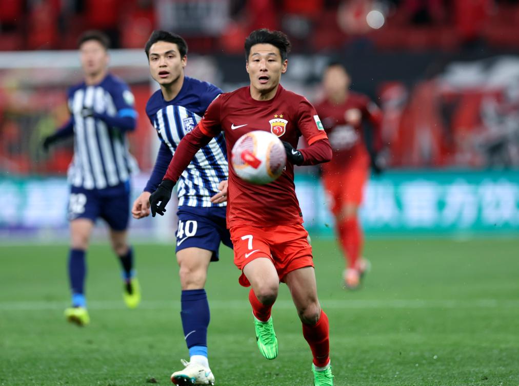 資料圖:2024年3月1日,上海海港隊(duì)球員武磊(右)在2024賽季中國足球協(xié)會超級聯(lián)賽揭幕戰(zhàn)中。新華社發(fā)(海沙爾攝)