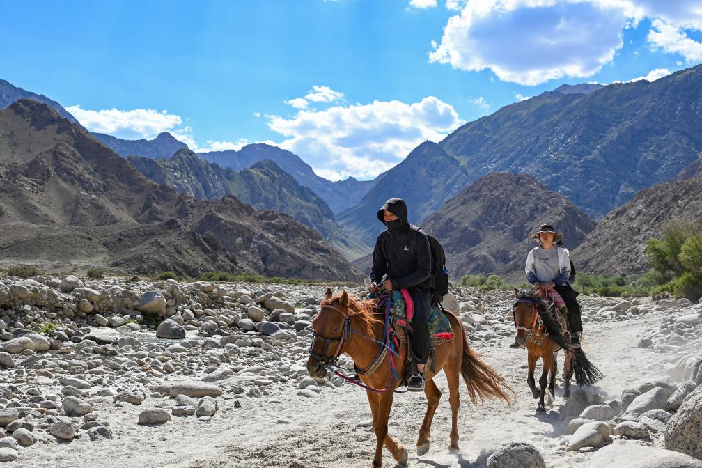 6月9日,游客騎馬進入烏孫古道體驗。當日,在新疆阿克蘇地區(qū)拜城縣,2024年新疆“跟著賽事去旅行”烏孫古道國際徒步露營大會啟動。新華社記者 陳朔 攝