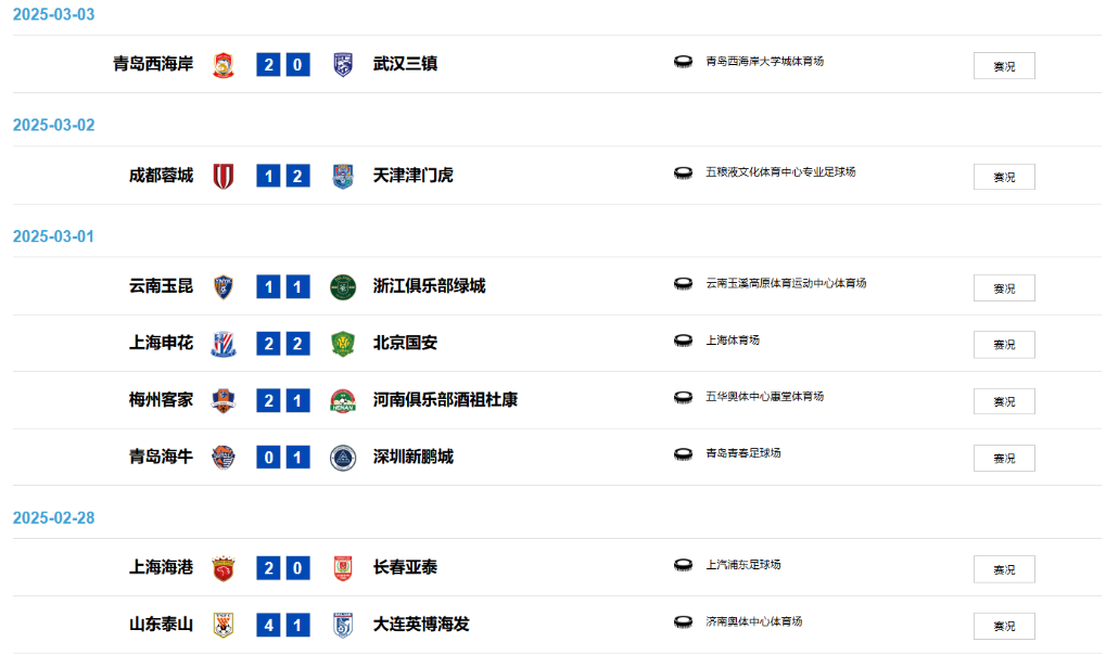圖為2025賽季中超聯(lián)賽第二輪賽果。圖片來自中國足球職業(yè)聯(lián)賽聯(lián)合會官網(wǎng)