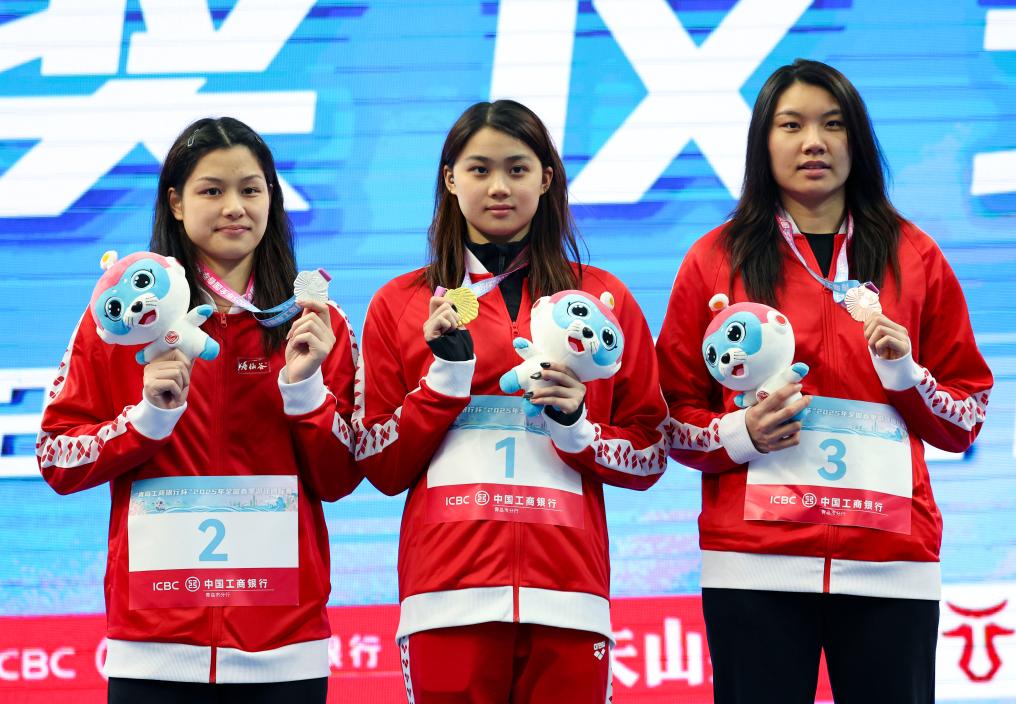 3月18日,冠軍浙江隊(duì)選手鄭惠予(中)、亞軍浙江隊(duì)選手余依婷(左)和季軍浙江隊(duì)選手柳雅欣在女子200米個(gè)人混合泳頒獎(jiǎng)儀式上。新華社記者 雒圓 攝