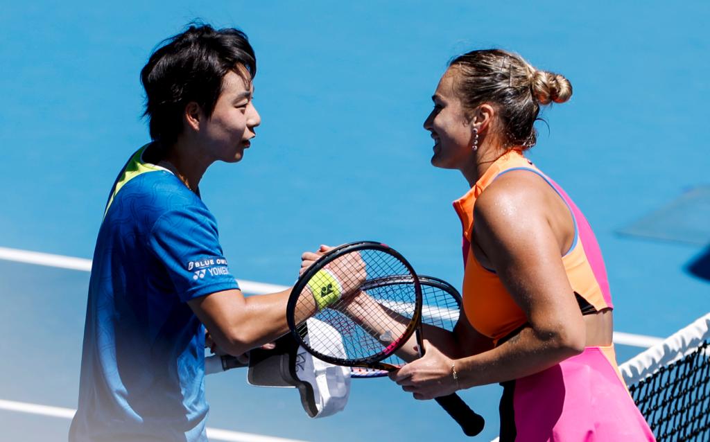 1月21日,中國(guó)選手白卓璇(左)與白俄羅斯選手薩巴倫卡賽后握手致意。新華社記者 馬平 攝