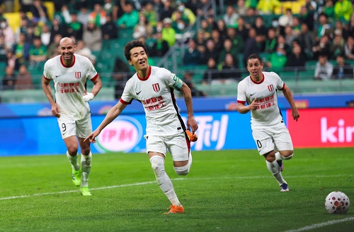 4月12日,成都蓉城隊球員韋世豪(中)在比賽中慶祝進球。新華社發(fā)(馬子涵 攝)