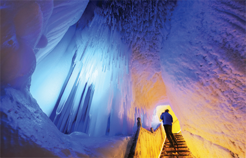 萬年冰洞深100多米,一年四季洞內溫度在零下4攝氏度到零下10攝氏度,寒冷無比,積冰常年不化,與洞外形成截然不同的兩個世界。當洞外鳥語花香之時,洞內卻依然寒氣逼人。在洞內冰筍、冰柱、冰錐、冰葡萄等千姿百態(tài),形狀各異的美景奇觀隨處可見。