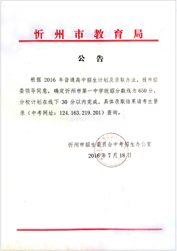 根據(jù)2016年普通高中招生計劃及錄取辦法,報市招委領(lǐng)導(dǎo)同意,確定忻州市第一中學(xué)統(tǒng)招分?jǐn)?shù)線為650分,分校計劃在線下30分內(nèi)完成。具體錄取結(jié)果請考生登錄(中考網(wǎng)址:124.163.219.201)查詢。