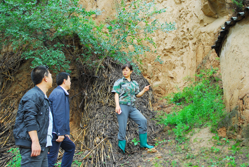 首先,一行人員來到合索鄉(xiāng)作頭村,對3戶涉及地質災害隱患點的居民進行了監(jiān)測巡查。其中,有兩戶居民已在工作人員的勸導下搬遷,唯有63歲的徐愛萍老人還留守在隱患點居住。該居所主要隱患點位于院落南房,緊靠土崖而建,高出房頂約6米左右。白蕾一行對隱患點進行詳細監(jiān)測并做記錄后,囑咐監(jiān)測員要隨時查看土崖的變化,及時報告。同時叮囑徐愛萍老人近期不要靠近隱患點,以免發(fā)生意外。