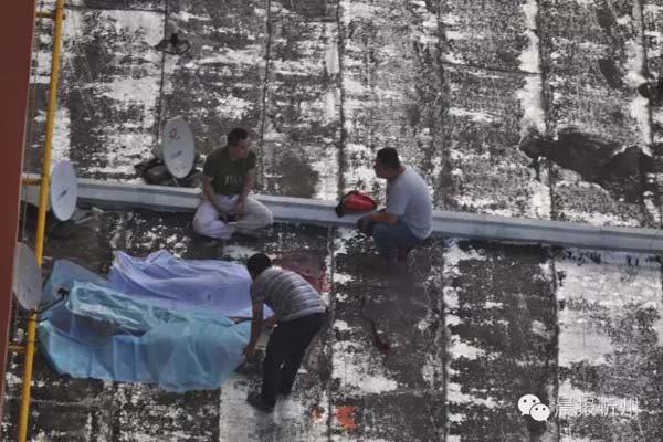 回想起那一瞬間,一位不愿意透露姓名的目擊者驚魂未定,據(jù)他介紹:“早上大概五點(diǎn)半左右,我和愛人正熟睡。突然,聽到外面”砰“的一聲,驚醒了我們,老婆還自言自語說樓上又有人往樓下亂扔?xùn)|西,話音剛落,又一物體重重的墜地的聲音傳來,匆忙起床,跑到窗口往下看,只見一女子面朝房頂趴在商鋪樓頂。”