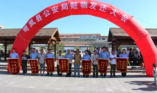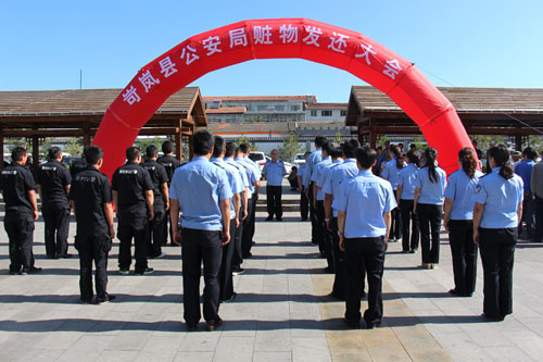 為集中展示今年以來(lái)打擊違法犯罪取得的成果,震懾犯罪,7月28日上午,岢嵐縣公安局在舟城廣場(chǎng)舉行贓物發(fā)還大會(huì)。岢嵐縣公安局政委劉新宇、副局長(zhǎng)李學(xué)峰、政工監(jiān)督室主任高文光及局機(jī)關(guān)民警以及領(lǐng)取贓物的群眾參加了活動(dòng)。