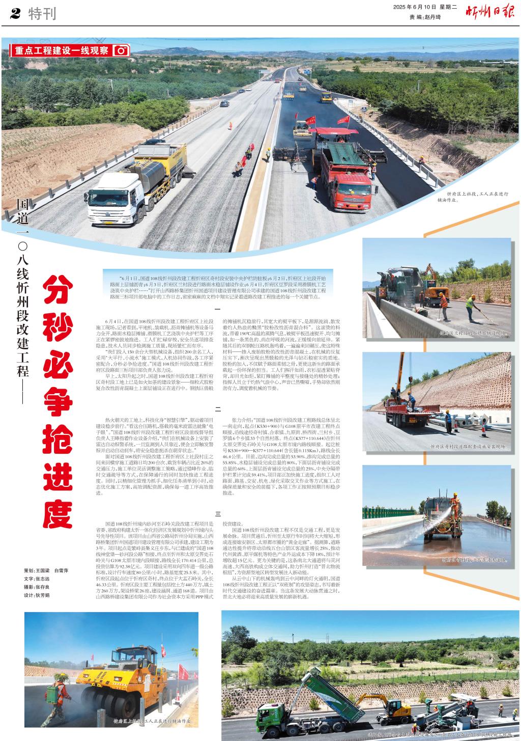 “6月1日,國道108線忻州段改建工程忻府區(qū)奇村段安裝中央護欄防眩板;6月2日,忻府區(qū)上社段開始路面上層鋪瀝青;6月3日,忻府區(qū)蘭村段進行路面水穩(wěn)層鋪設作業(yè);6月4日,忻府區(qū)豆羅段采用滑膜機工藝澆筑中央護欄……”打開山西路橋集團忻州國道項目建設管理有限公司承建的國道108線忻州段改建工程路面三標項目部電腦中的工作日志,密密麻麻的文檔中翔實記錄著道路改建工程推進的每一個關鍵節(jié)點。