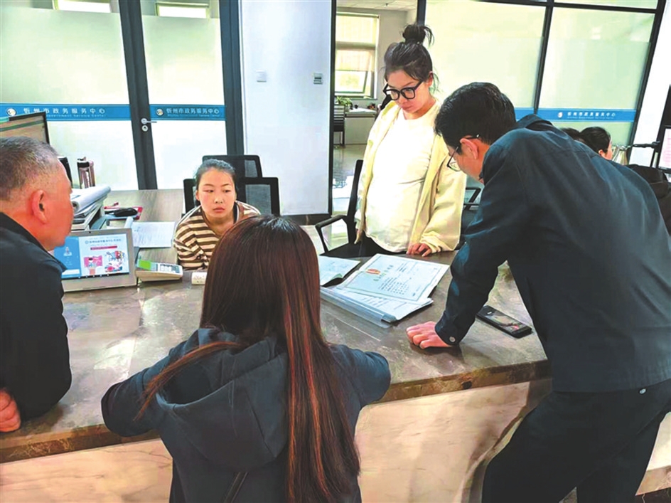 市政務(wù)大廳一樓不動產(chǎn)轉(zhuǎn)移綜合窗口,實現(xiàn)稅務(wù)+不動產(chǎn)登記一窗受理、并行辦理,日均辦理400件以上。