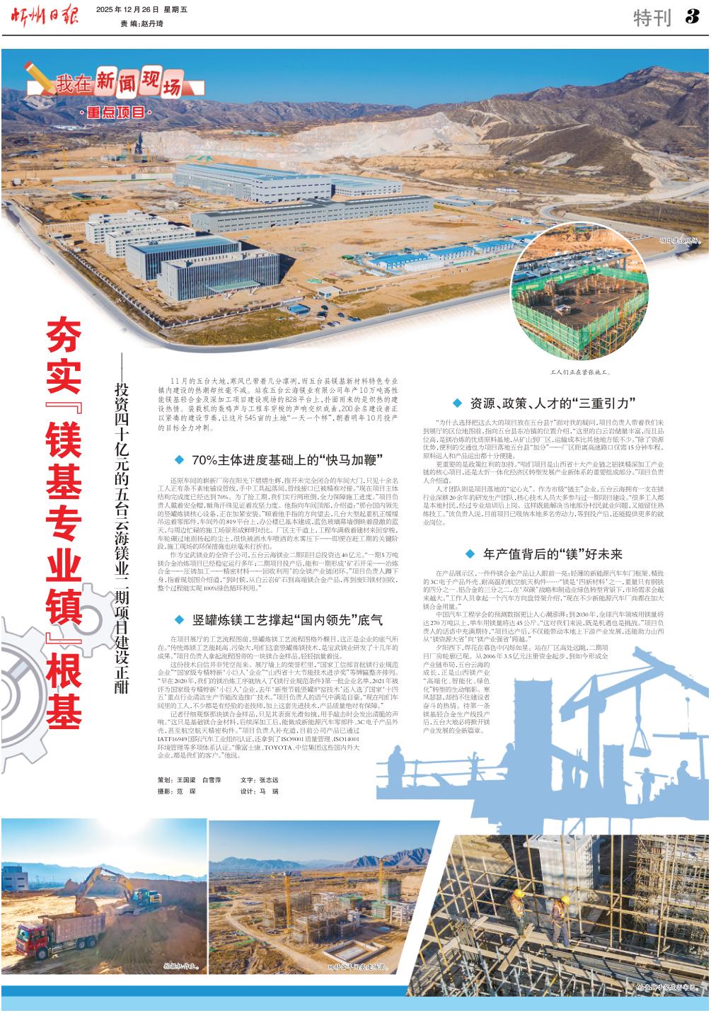 夕陽西下,焊花在暮色中閃爍如星。站在廠區(qū)高處遠眺,二期項目廠房輪廓已現(xiàn)。從2006年3.5億元注冊資金起步,到如今形成全產(chǎn)業(yè)鏈布局,五臺云海的成長,正是山西鎂產(chǎn)業(yè)“高端化、智能化、綠色化”轉(zhuǎn)型的生動縮影。寒風(fēng)瑟瑟,卻擋不住建設(shè)者奮斗的熱情。待第一條鎂基輕合金生產(chǎn)線投產(chǎn)后,五臺大地必將掀開鎂產(chǎn)業(yè)發(fā)展的全新篇章。