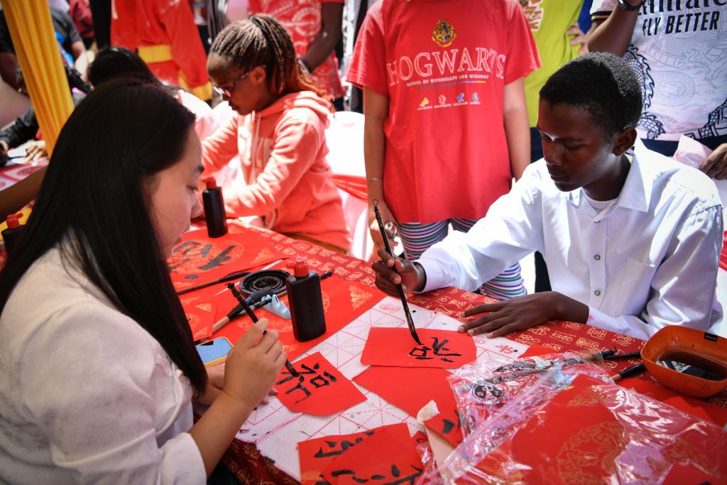 2月10日,在肯尼亞首都內(nèi)羅畢,人們?cè)趦?nèi)羅畢中國(guó)春節(jié)廟會(huì)上體驗(yàn)中國(guó)書法。(新華社記者韓旭 攝)