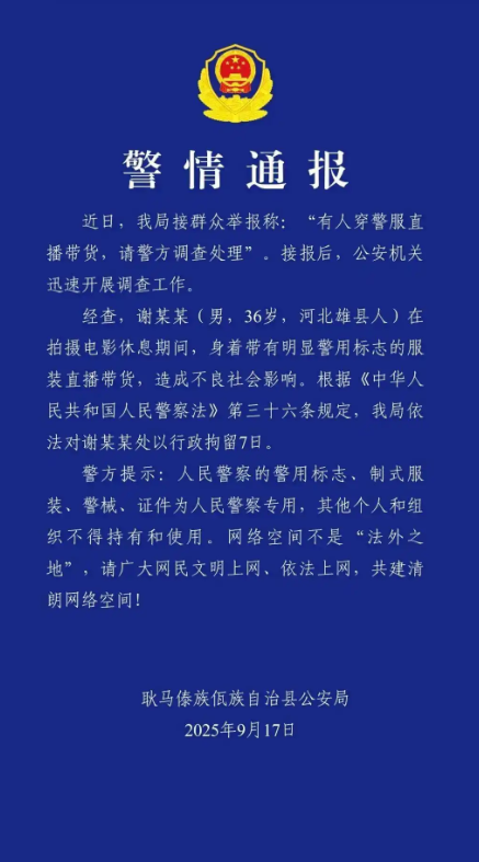 近日,演員謝孟偉(網(wǎng)絡(luò)俗稱“嘎子哥”)在直播帶貨過(guò)程中身穿警服,被公安機(jī)關(guān)依法處以行政拘留七日的處罰。該處理結(jié)果獲得輿論普遍支持,體現(xiàn)出社會(huì)對(duì)公權(quán)力象征符號(hào)神圣性的共同維護(hù)。據(jù)通報(bào),謝某在電影拍攝休息期間,身著配有警用標(biāo)志的制式警服公開(kāi)推銷(xiāo)電子產(chǎn)品,并聲稱“穿警服需通過(guò)政審”“公安機(jī)關(guān)應(yīng)當(dāng)配合工作”,企圖利用警服所承載的公信力為其商業(yè)行為背書(shū)。