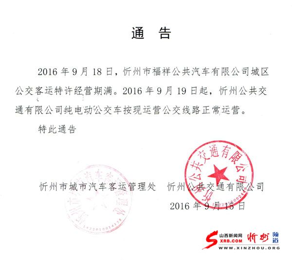 2016年9月18日,忻州市福祥公共汽車有限公司城區(qū)公交客運(yùn)特許經(jīng)營期滿。2016年9月19日起,忻州公共交通有限公司純電動(dòng)公交車按現(xiàn)運(yùn)營公交線路正常運(yùn)營。