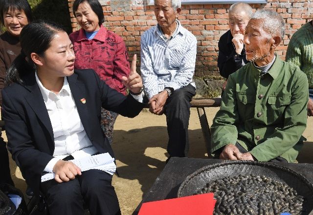 安徽省金寨縣花石鄉(xiāng)大灣村扶貧工作隊(duì)副隊(duì)長(zhǎng)余靜(前左)在金寨縣大灣村與村民交流。新華社發(fā)