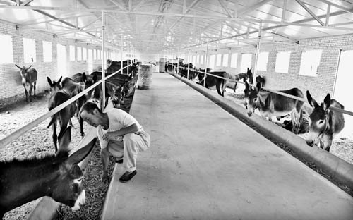 河曲縣樓子營(yíng)鎮(zhèn)柏鹿泉村驛騰養(yǎng)殖專業(yè)合作社由致富帶頭人趙志文2017年9月創(chuàng)辦,主要從事肉驢養(yǎng)殖,該合作社采取“合作社+貧困戶”的產(chǎn)業(yè)發(fā)展模式,貧困戶每養(yǎng)一頭驢固定收益1180元,有效帶動(dòng)當(dāng)?shù)睾椭苓?0個(gè)村439戶823人增收致富。目前,現(xiàn)存欄肉驢600頭,年盈利70余萬元。圖為一名飼養(yǎng)員在為驢添加飼草。(鄔耿杰 攝)