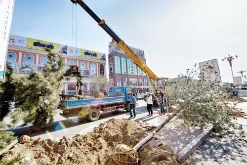 圖為園林工人在長征街挖運(yùn)油松。智芝龍 趙曉煒 攝