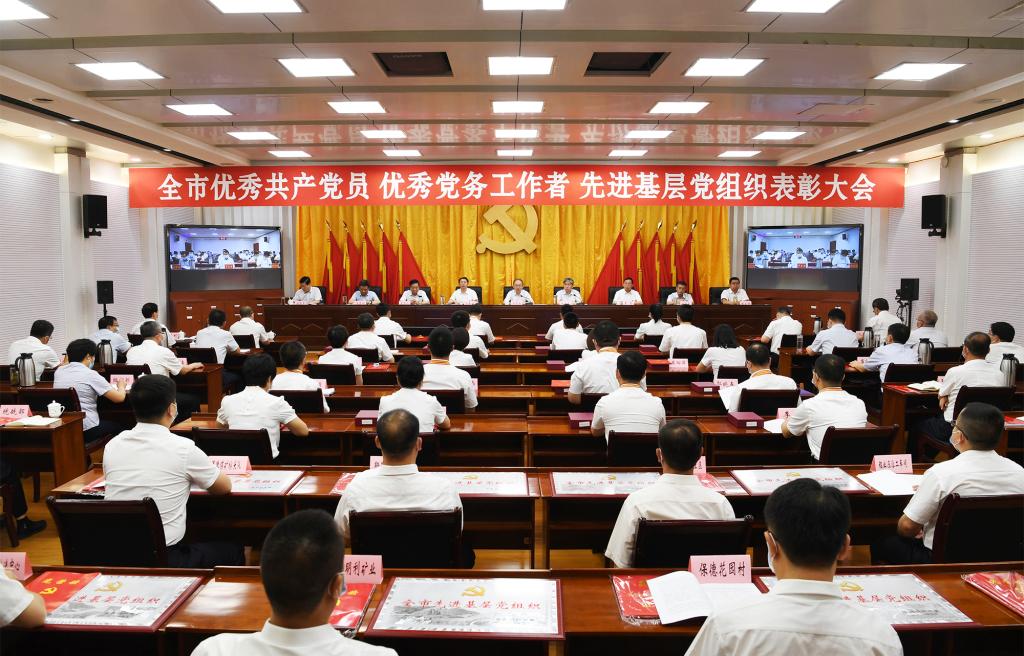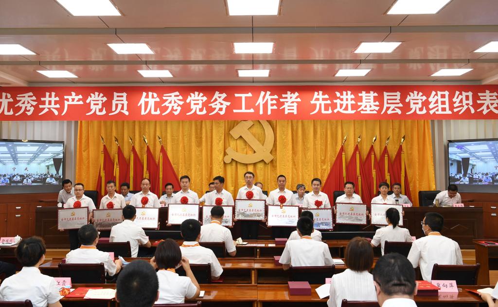 上午8時30分,大會正式開始,全體起立,奏唱國歌。來自全市各行各業(yè)、在工作中取得優(yōu)異成績的99名共產(chǎn)黨員、100名黨務(wù)工作者和100個基層黨組織,分別被授予“全市優(yōu)秀共產(chǎn)黨員”“全市優(yōu)秀黨務(wù)工作者”“全市先進基層黨組織”榮譽稱號。受到表彰的優(yōu)秀個人和先進集體代表先后上臺領(lǐng)獎,會場響起熱烈掌聲。