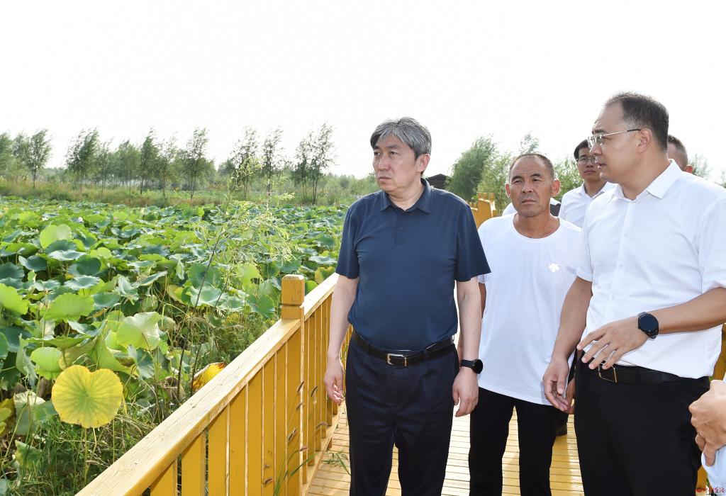 在吉福寺農(nóng)場。馮曉磊 攝 在吉福寺農(nóng)場,朱曉東深入田間地頭實地查看農(nóng)作物長勢,與農(nóng)場負責人面對面交流,仔細詢問農(nóng)產(chǎn)品品種、畝產(chǎn)量、耕種模式、農(nóng)旅融合發(fā)展等情況。他指出,要加快轉(zhuǎn)變發(fā)展觀念,立足農(nóng)場資源稟賦,找準農(nóng)旅融合發(fā)展的切入點,把旅游產(chǎn)業(yè)和農(nóng)業(yè)產(chǎn)業(yè)有機結(jié)合,高標準高品質(zhì)打造有鄉(xiāng)村氣息的參與式、觀光式和體驗式旅游產(chǎn)品。要充分挖掘鹽堿地綜合利用潛力,因地制宜抓好技術(shù)推廣、品種選育等工作,大力探索鹽堿地治理改良的有效方法,深度做好鹽堿地特色農(nóng)業(yè)大文章。