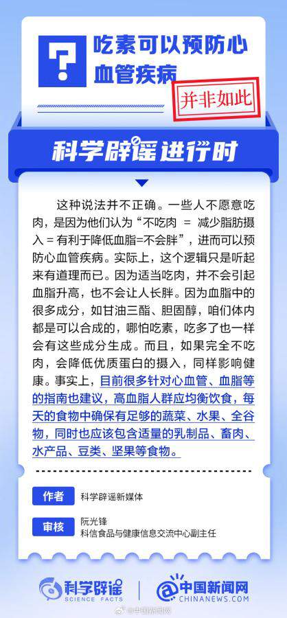 一些人不愿意吃肉,是因為他們認(rèn)為“不吃肉=減少脂肪攝入=有利于降低血脂=不會胖”,進(jìn)而可以預(yù)防心血管疾病。實際上,這個邏輯只是聽起來有道理而已。因為適當(dāng)吃肉,并不會引起血脂升高,也不會讓人長胖。如果完全不吃肉,會降低優(yōu)質(zhì)蛋白的攝入,同樣影響健康。(來源:@科學(xué)辟謠 中國新聞網(wǎng)微博)