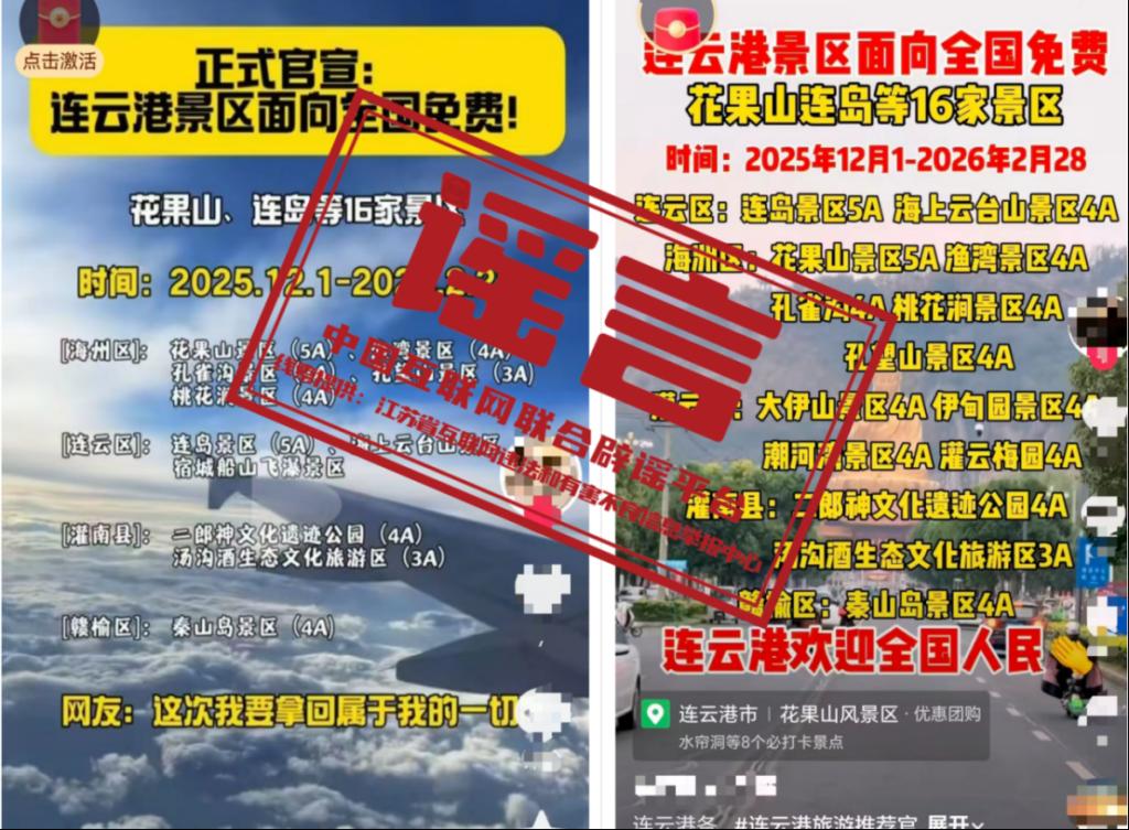 謠言:江蘇連云港景區(qū)“2025年12月1日至2026年2月28日面向全國免費(fèi)”?