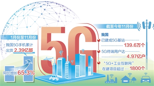 我國5G網(wǎng)絡建設和應用正加速推進。截至今年11月份,已建成5G基站139.6萬個,5G終端用戶達到4.97億戶,“5G+工業(yè)互聯(lián)網(wǎng)”在建項目超過1800個。