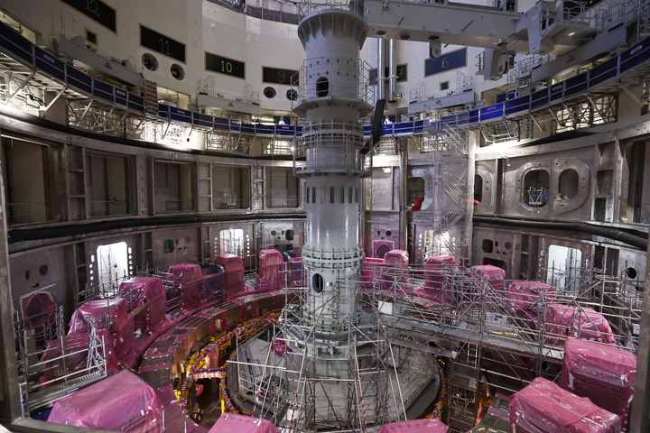 這是11月23日在位于法國(guó)圣保羅-萊迪朗斯的國(guó)際熱核聚變實(shí)驗(yàn)反應(yīng)堆(ITER)建設(shè)現(xiàn)場(chǎng)拍攝的安裝中的托卡馬克裝置。(梁希之 攝)