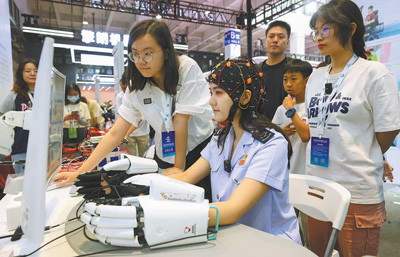 觀眾在北京舉辦的世界機(jī)器人博覽會(huì)上體驗(yàn)人工智能多模態(tài)腦機(jī)接口平臺(tái)。陳曉根攝(人民視覺)