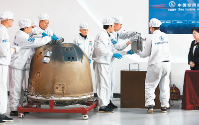 在中國(guó)航天科技集團(tuán)五院舉行的嫦娥六號(hào)返回器開(kāi)艙儀式現(xiàn)場(chǎng),科研人員取出月球樣品容器準(zhǔn)備稱重。新華社記者 金立旺攝