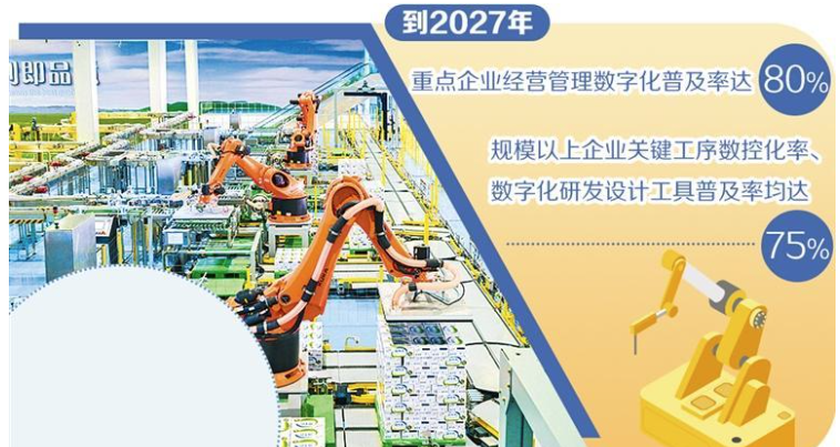 工業(yè)和信息化部等7部門日前印發(fā)《食品工業(yè)數(shù)字化轉(zhuǎn)型實(shí)施方案》(以下簡稱《實(shí)施方案》)提出,到2027年,重點(diǎn)企業(yè)經(jīng)營管理數(shù)字化普及率達(dá)80%,規(guī)模以上企業(yè)關(guān)鍵工序數(shù)控化率、數(shù)字化研發(fā)設(shè)計工具普及率均達(dá)到75%,打造百個數(shù)字化轉(zhuǎn)型典型應(yīng)用場景,梯次實(shí)施千個數(shù)字化示范(試點(diǎn))項目。