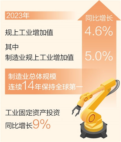 記者日前從工業(yè)和信息化部獲悉:2023年,全年規(guī)模以上工業(yè)增加值同比增長4.6%,較2022年提升1個百分點,其中制造業(yè)規(guī)模以上工業(yè)增加值同比增長5.0%,我國制造業(yè)總體規(guī)模連續(xù)14年保持全球第一。