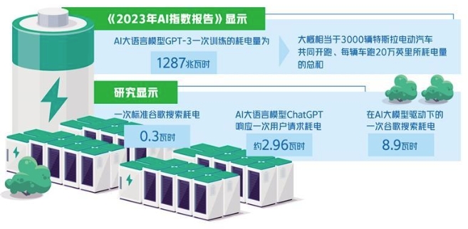 人工智能大模型到底有多耗能?據斯坦福人工智能研究所發(fā)布的《2023年AI指數報告》,AI大語言模型GPT-3一次訓練的耗電量為1287兆瓦時,大概相當于3000輛特斯拉電動汽車共同開跑、每輛車跑20萬英里所耗電量的總和。報告同時提出,AI大語言模型GPT-3一次訓練,相當于排放了552噸二氧化碳。